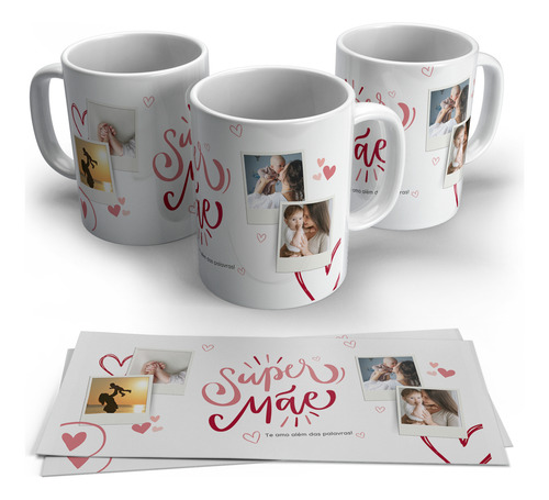 – A imagem representa a caneca vista de três ângulos diferentes e a arte aberta para uma visão geral.