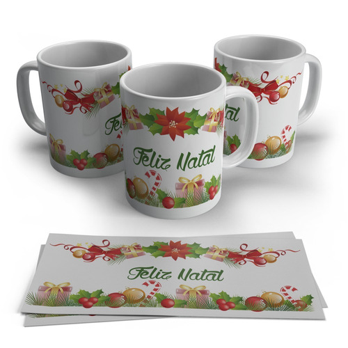 – A imagem representa a caneca vista de três ângulos diferentes e a arte aberta para uma visão geral.