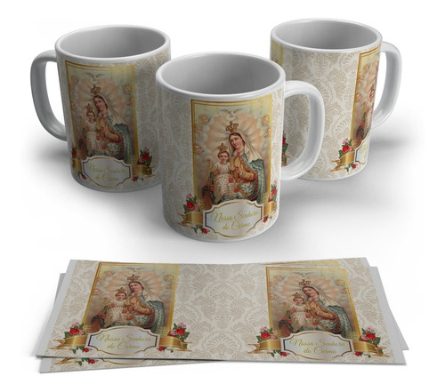 – A imagem representa a caneca vista de três ângulos diferentes e a arte aberta para uma visão geral.