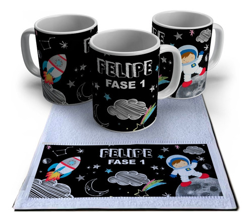 Kit Escolar Caneca E Toalha Personalizados Astronauta